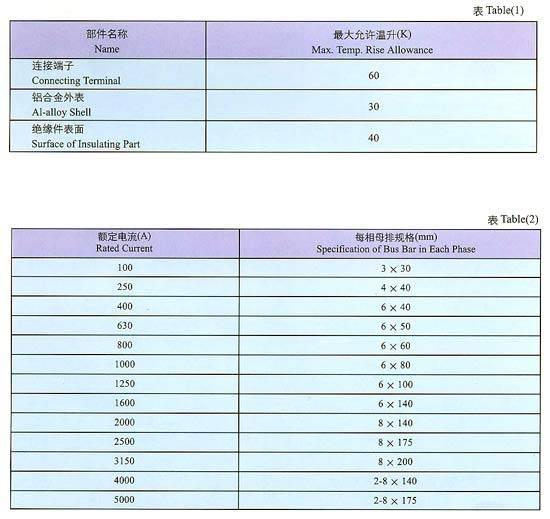 母线槽在长期通以额定电流时,其导电部位的温升不超过表(1)的值。